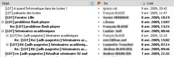 Vu la quantité des messages et les nombreuses réponses, il faut privilégier un affichage sous forme de fil de discussion, d’enfilade ou de « thread » en anglais. Cette disposition des messages (comme vous pouvez le voir sur la photo ci-dessous) assure un ordre logique et hiérarchique entre les messages originaux et les différentes réponses apportées à celui-ci.
