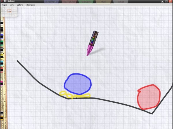 PhysicDraw vous propose un marqueur, qui vous permet de dessiner des formes. En un seul clic droit, vous choisissez le matériau utilisé (glace, métal, plastique, ballon...) qui auront chacun un comportement différent en fonction de leurs caractéristiques.